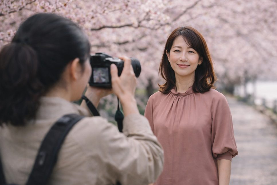 できるだけシンプルな背景を選ぶことで、人物の表情や雰囲気が伝わりやすくなります。公園の緑や街並み、カフェの外観など、落ち着いた背景を選ぶと写真全体が自然にまとまります。